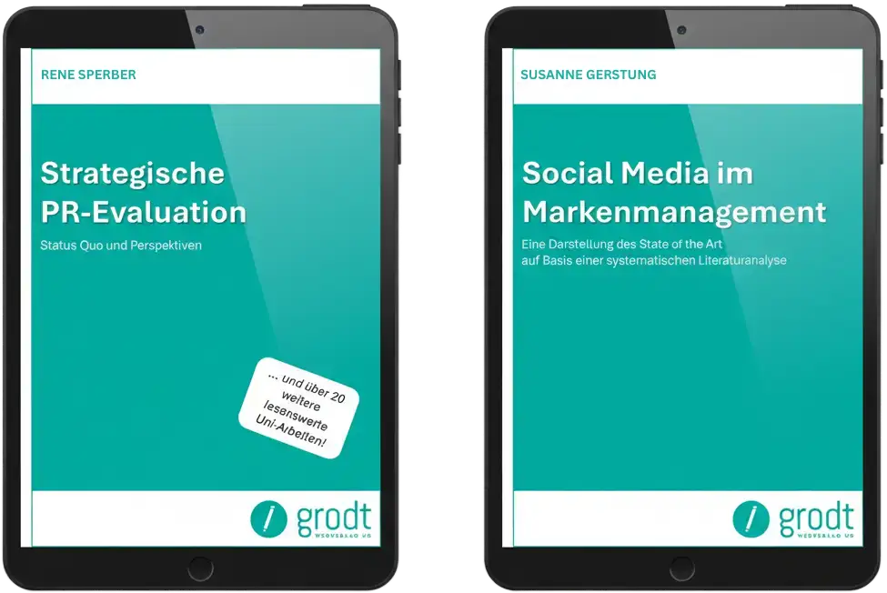 Du hast eine wissenschaftliche Arbeit geschrieben, die mehr Sichtbarkeit verdient? Wir prüfen ausgewählte Abschlussarbeiten und Fachtexte für eine Veröffentlichung im Grodt Webverlag. Schreib uns einfach eine E-Mail mit deiner Arbeit als PDF-Anhang.